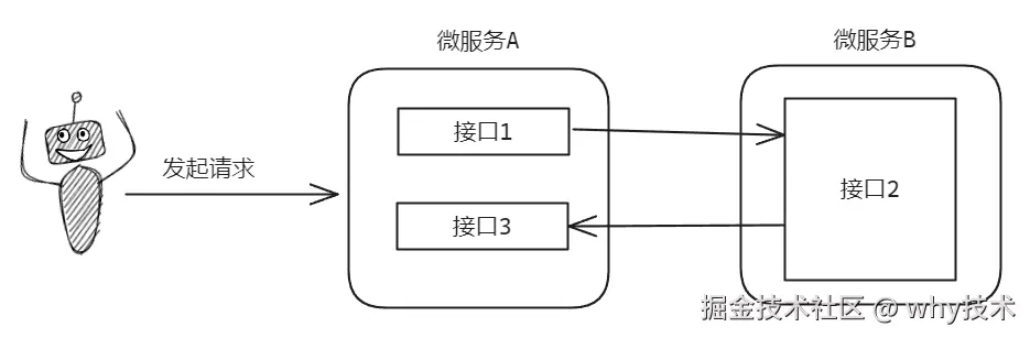 上游发起请求到微服务 A 的接口 1,该接口需要调用微服务 B 的接口 2。