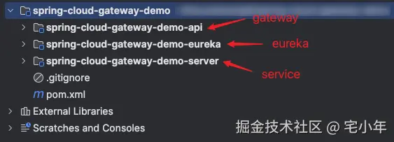 spring-cloud-gateway-demo-eureka:注册中心,负责管理微服务;spring-cloud-gateway-demo-api:网关服务,负责路由转发;spring-cloud-gateway-demo-server: 提供网关转发的 API接口的服务;