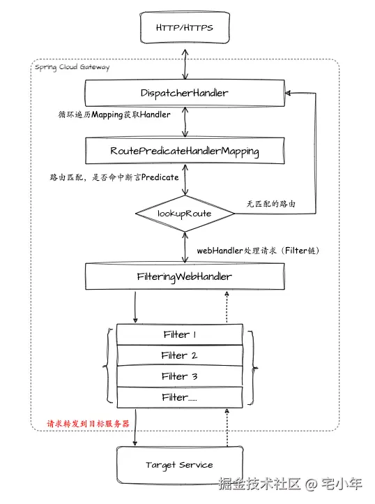 客户端向 Spring Cloud Gateway 发出请求,Gateway Handler Mapping 处理请求,确定请求与路由是否匹配,然后交给 Gateway Web Handler 处理。