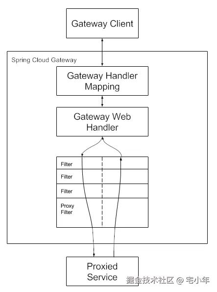 而 Gateway Web Handler 实际上就是一组过滤器(Filter),按顺序执行完所有的 Filter 后,通过 Proxy Filter 转发请求,调用其他服务接口。