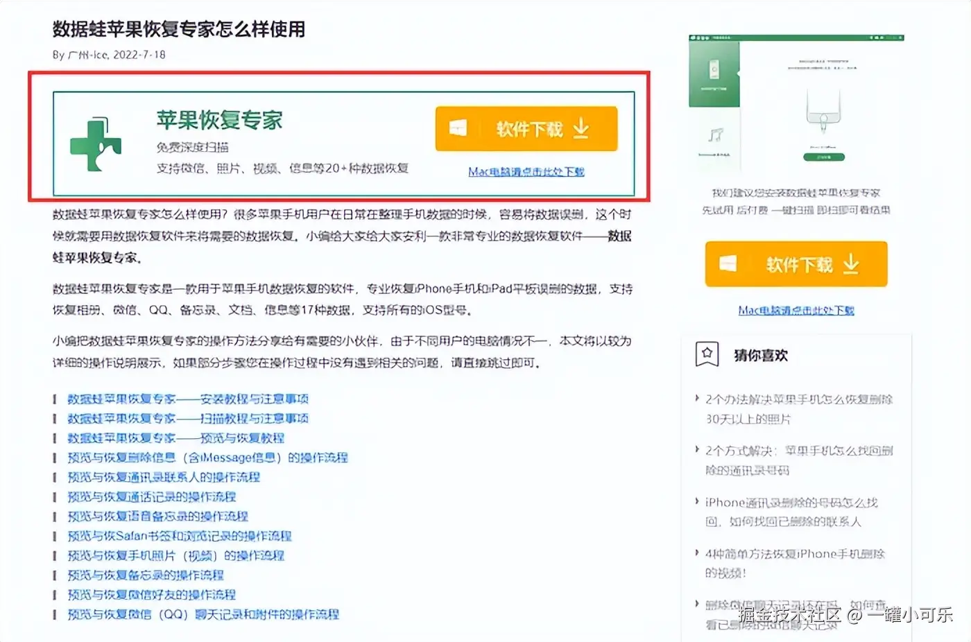 步骤1:在浏览器中搜索【数 据 蛙 苹果恢复专家】,点击下载并安装到电脑上 (根据电脑系统选择对应的Mac/Windows版本下载) 。
