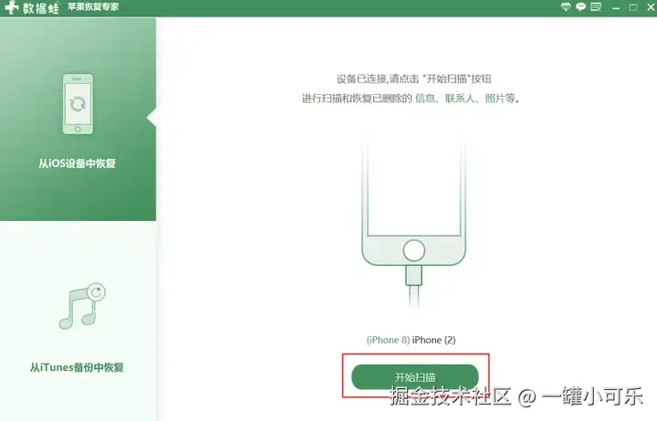 步骤2:安装完成后,打开软件,使用苹果手机原装数据线连接电脑,点击 【开始扫描】 按钮,等待软件扫描手机上的数据。