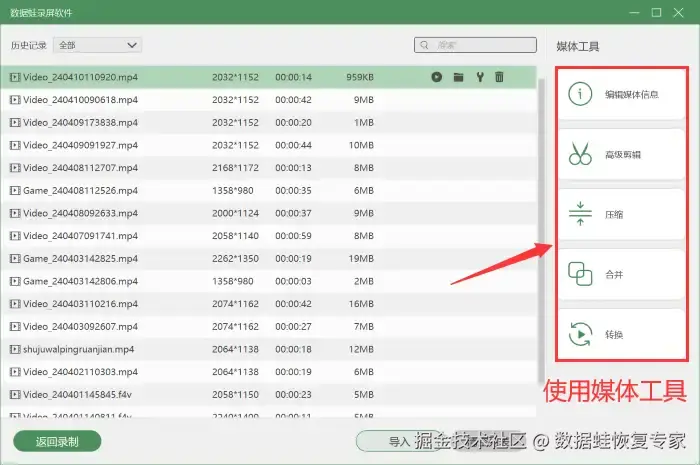步骤4:录制完成的视频您可以进入 【高级剪辑】 页面对其进行裁剪、分段、添加特效等操作。也可以在【历史记录】页面使用媒体工具进行压缩、合并、格式转换等功能。