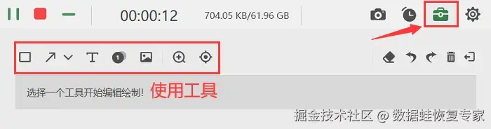 步骤3:在录制的过程中,可以使用 【工具箱】 里的工具对您的视频进行标注、添加文字图片、放大等操作。