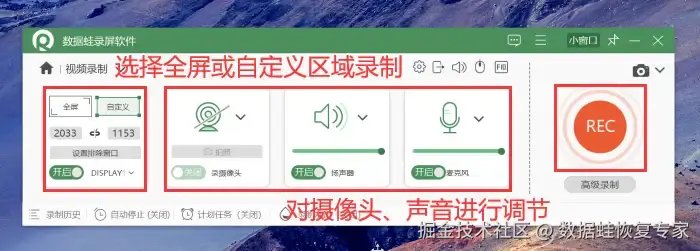 步骤2:在 【视频录制】 界面,根据需求选择录制的区域,也可对摄像头、声音等进行设置,确认设置后,即可开始录制屏幕。