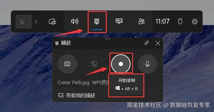 步骤2:点击 【小摄像头】 标志,再点击 【圆形】 标志即可进入录屏。电脑录屏是按哪三个键?为了进行快速录屏,您也可以通过 【Win+Alt+R】 进入录屏。