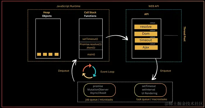 Web API 是异步操作(setTimeout、fetch requests、promises)及其回调等待完成的地方。它从线程池中借用线程, 在不阻塞主线程的情况下在后台完成任务。
