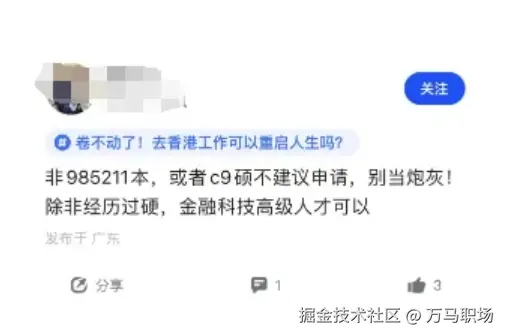 有网友称,如果没有过硬的学历或者金融科技的高级人才,也不建议去香港当炮灰。