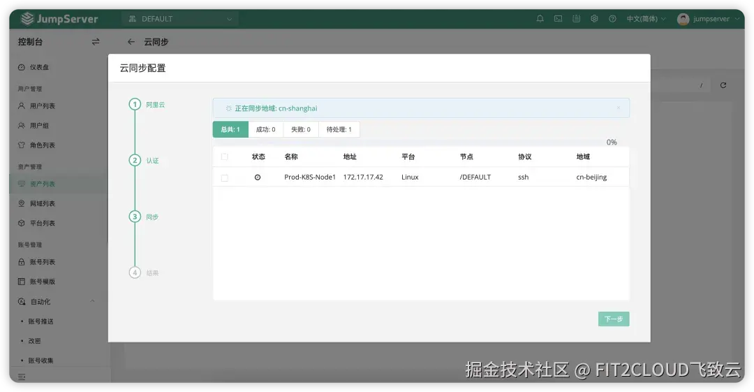 在JumpServer v4.0版本中,JumpServer的云同步模块进行了全新改版,简化了云同步功能的操作步骤,支持一键创建账号和执行同步任务,大幅提升了管理人员的运维效率。