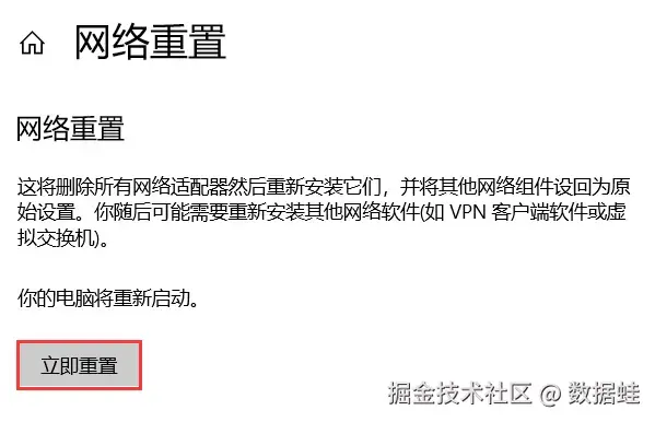 第二步:在状态页面,向下滚动并选择 “网络重置” ,点击 “立即重置” ,然后重启电脑。