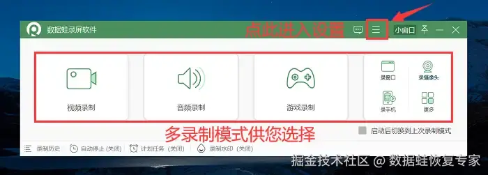 如果您想要录制电脑桌面上任意内容更加简单,视频能在保持超清晰的情况下还能小体积生成,还能进行多种录制模式,可以使用专业的电脑录屏软件——数 据 蛙录屏软件。