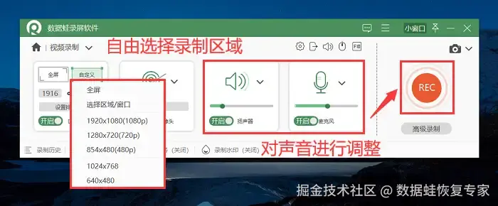 步骤3:进入 【视频录制】 页面可以自由设置录屏录制区域,以及摄像头、麦克风并调节声音大小等,点击 【REC】 按钮开始录制。