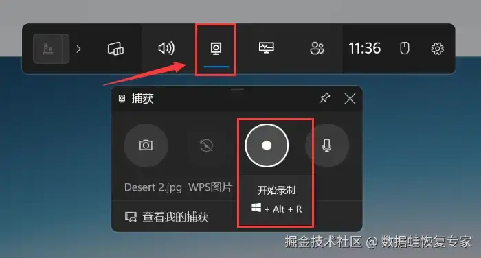 步骤2:点击小摄像头,调出 【捕获】 界面,点击 【圆形】 按钮即可进入录制。同样关于电脑录屏的快捷键,您也可以使用 【Win+Alt+R】 快速进行录屏。