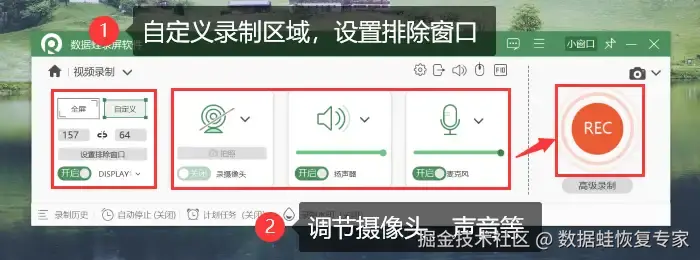 第三步:在 【视频录制】 页面,您可以进行全屏录制也可以选择区域进行录制,对摄像头、麦克风等进行调整。调整完毕就可以点击 【REC】 进行录制。