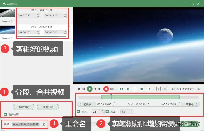 第四步:录制结束后,您可以进入 【高级剪辑】 中对您的视频进行剪辑、增加特效等功能,还可以对视频进行重命名,方便你的查找与分享。