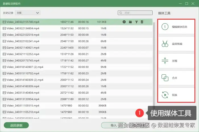 第五步:如果您需要对视频有更多的操作,可以在 【历史记录】 里对视频使用媒体工具进行压缩、合并、格式转换等操作。