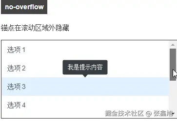 最后,新设计了个position-visibility属性,可以控制锚点定位元素和滚动边界的显隐关系。下图是值no-overflow的表现效果:
