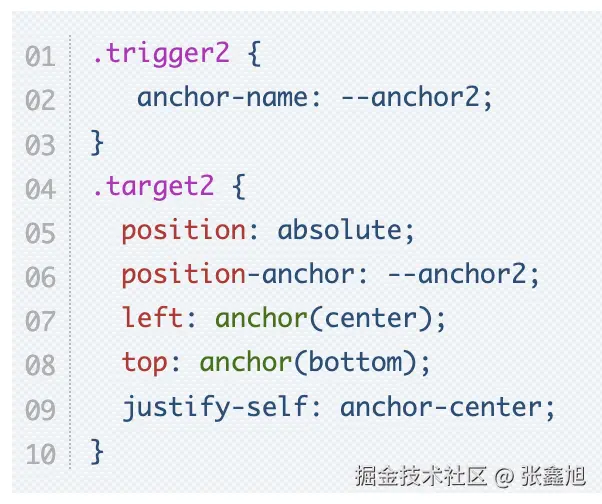 anchor-center是justify-self、align-self、justify-items和align-items等属性新支持的一个值,专门用在锚点定位中,可以让元素居中对齐显示,例如还是上面同样的HTML,则CSS这样就可以水平居中了。