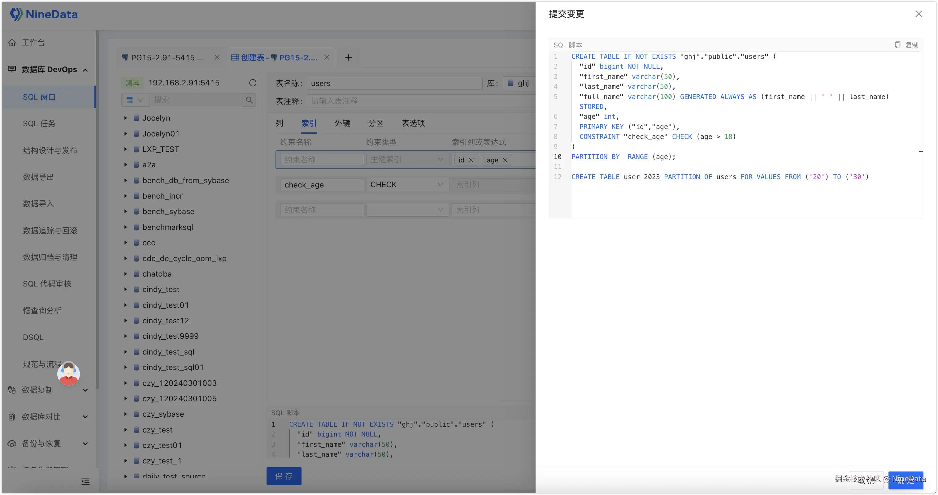 预览 SQL:配置完成后,单击页面上的保存,NineData 会把所有配置转换成具体的 SQL,确认无误后,单击确定即可。