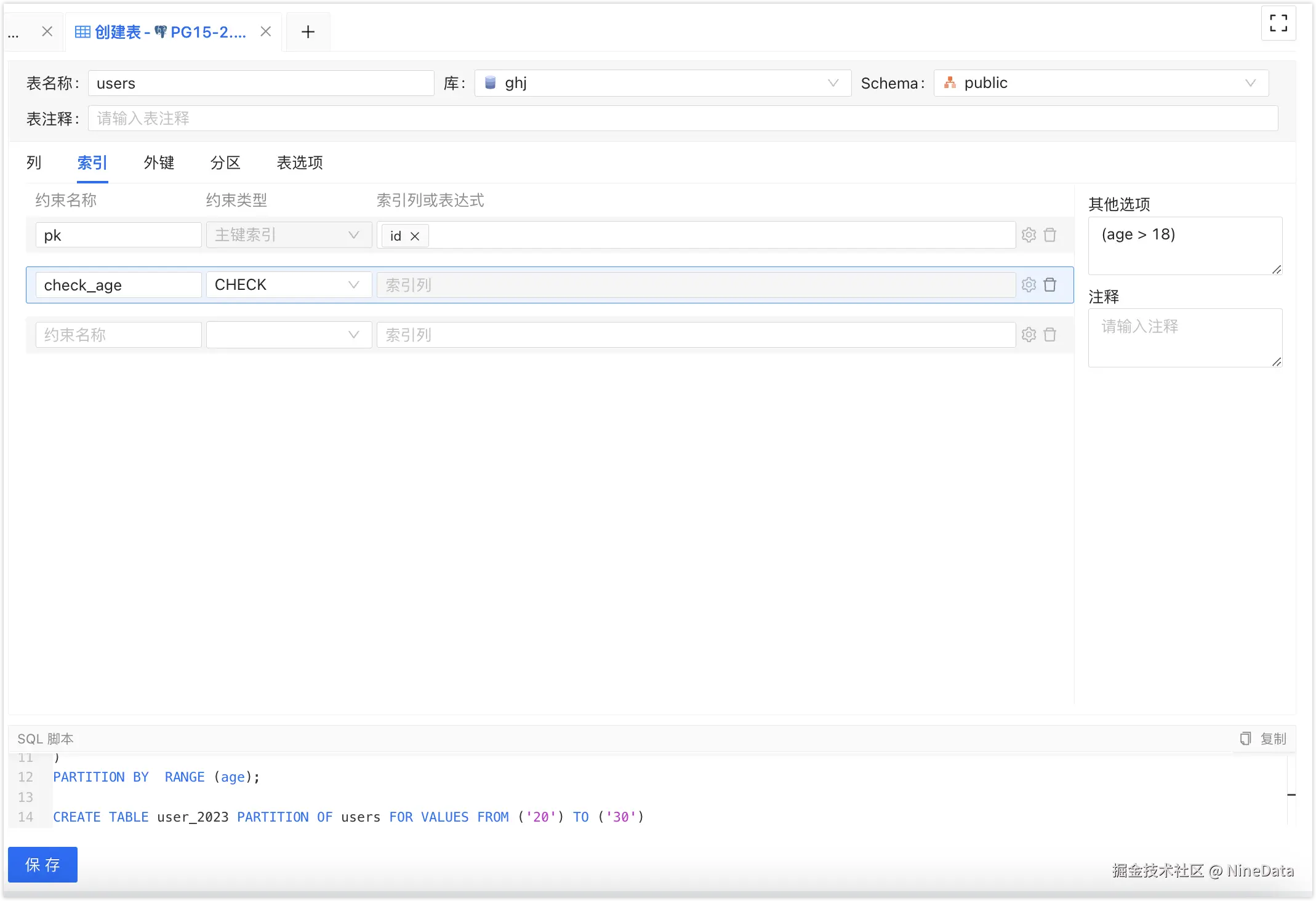 上图中,在 Partition By 中指定以 age 列的年龄范围进行分区,然后在 Partitions 中输入具体的分区语句。
