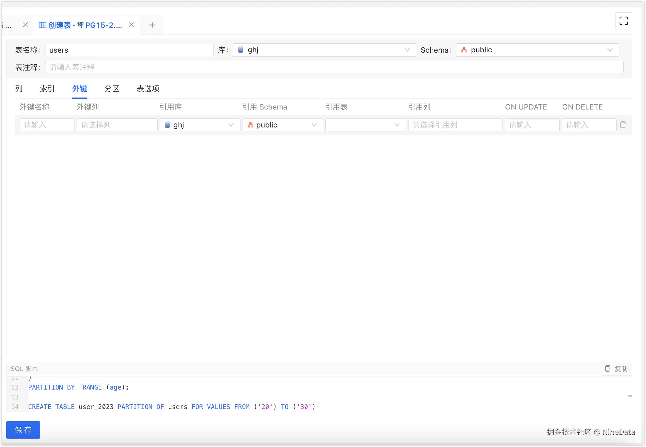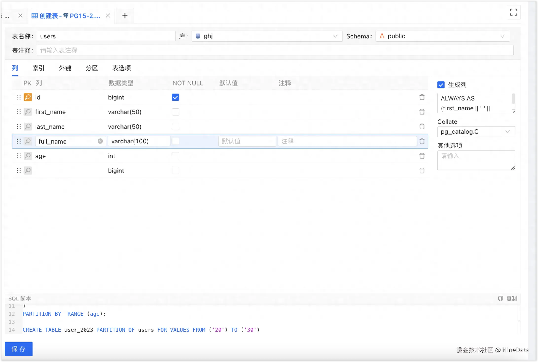 通过 NineData 的 SQL 窗口,可以可视化创建 PostgreSQL 表,几乎覆盖所有建表语句的能力。