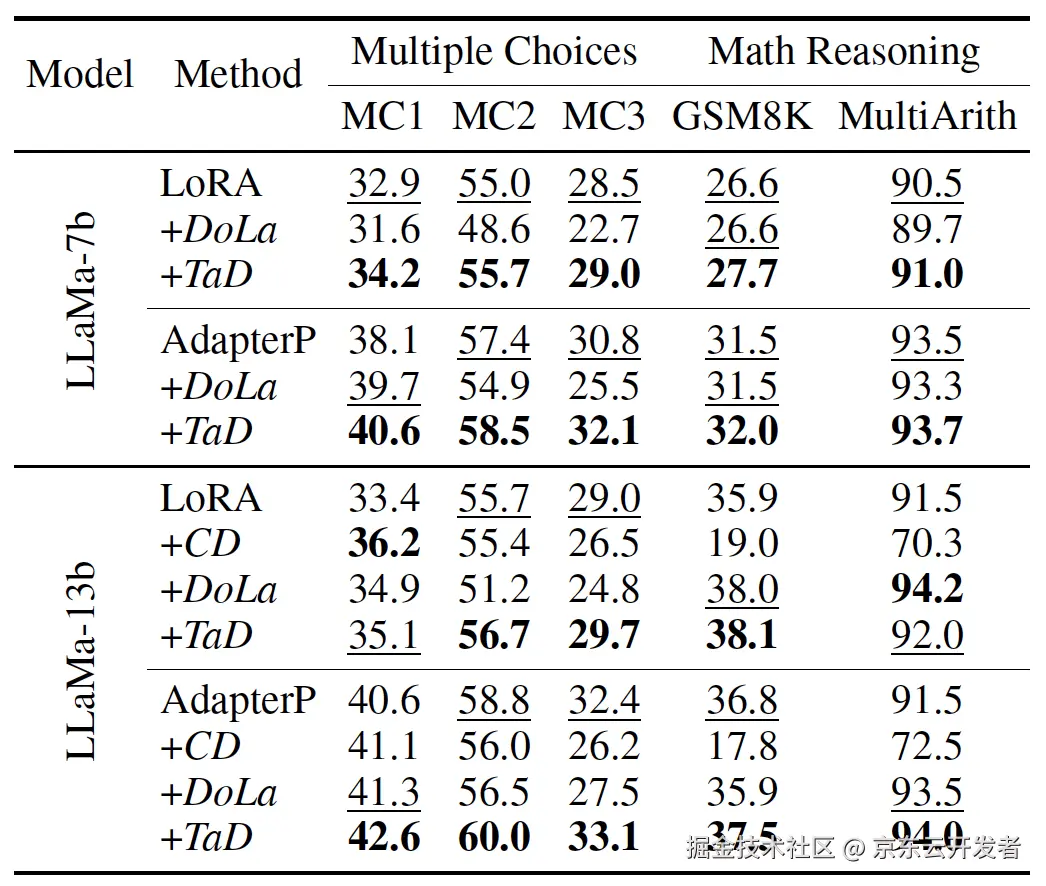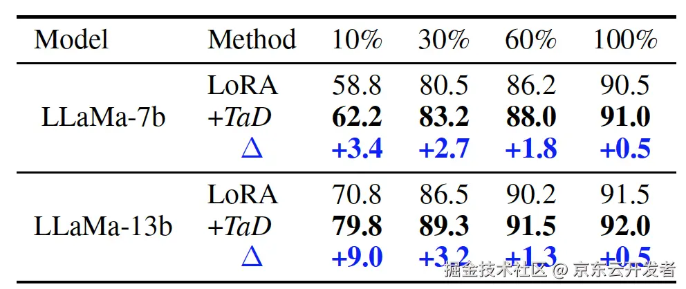 1)针对不同的LLM,采用LoRA、AdapterP等方式、在不同的任务上进行微调,实验结果如下表1和表2所示。注意到,TaD技术均取得了明显的正向效果提升。