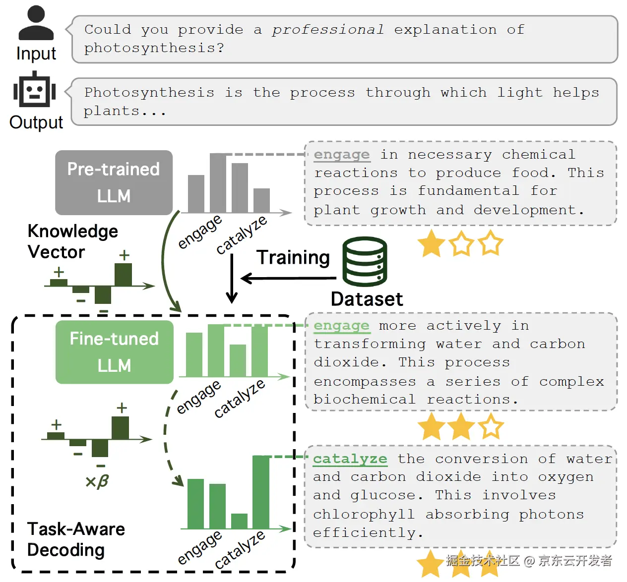 TaD的基本原理如图3所示。微调前LLM和微调后LLM的输出词均为“engage”,但深入探究不难发现其相应的预测概率分布发生了明显的改变,这反映了LLM在微调期间试图将其固有知识尽可能地适应下游任务的特定领域知识。具体而言,经过微调,更加符合用户输入要求(“专业的”)的词“catalyze”的预测概率明显增加,而更通用的反映预训练过程习得的知识却不能更好满足下游任务用户需求的词“engage”的预测概率有所降低。TaD巧妙利用微调后LLM与微调前LLM的输出概率分布的差异来构建知识向量,得到更贴切的输出词“catalyze”,进而增强LLM的输出质量,使其更符合下游任务偏好,改善幻觉。