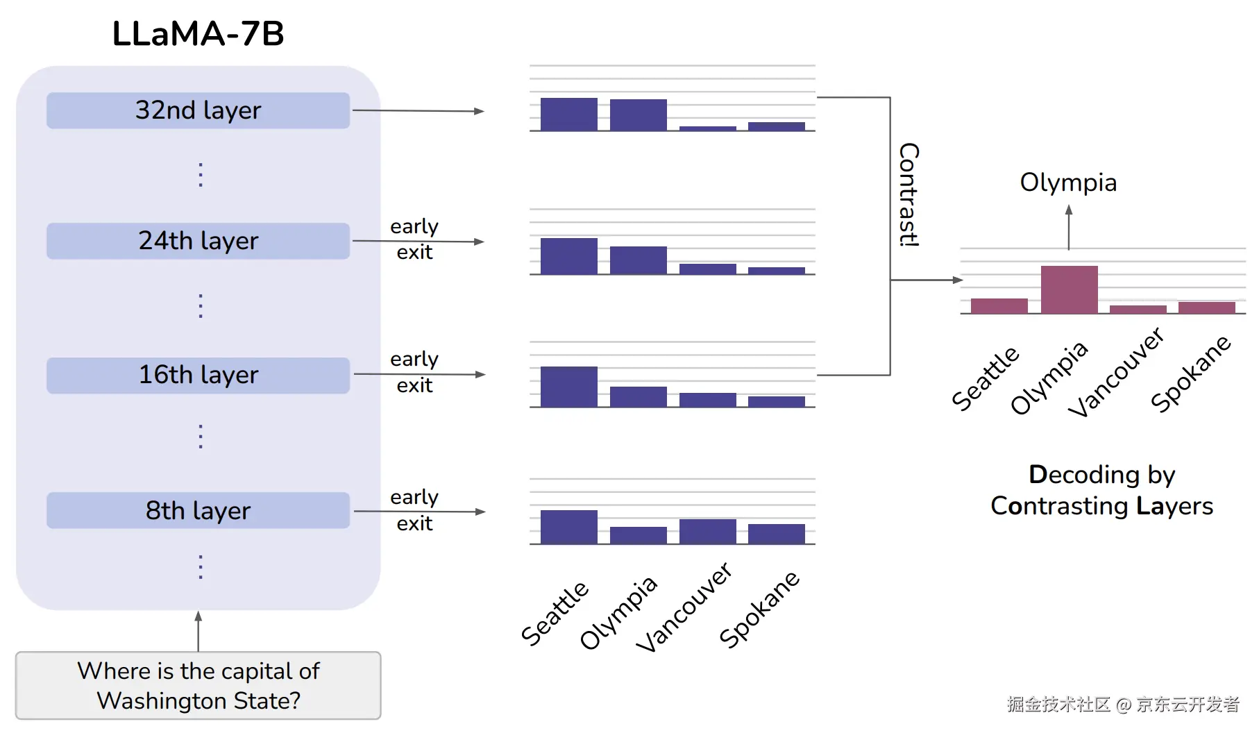 上图2是DoLa的一个简单直观的示例。“Seattle”在所有层上都保持着很高的概率,可能仅仅因为它是一个从语法角度上讲比较合理的答案。当上层通过层对比解码注入更多的事实知识后,正确答案“Olympia”的概率会增加。可见,层对比解码(DoLa)技术可以揭示真正的答案,更好地解码出LLM中的事实知识,而无需检索外部知识或进行额外微调。此外,DoLa还有动态层选择策略,保证最上层和中间层的输出差别尽可能大。