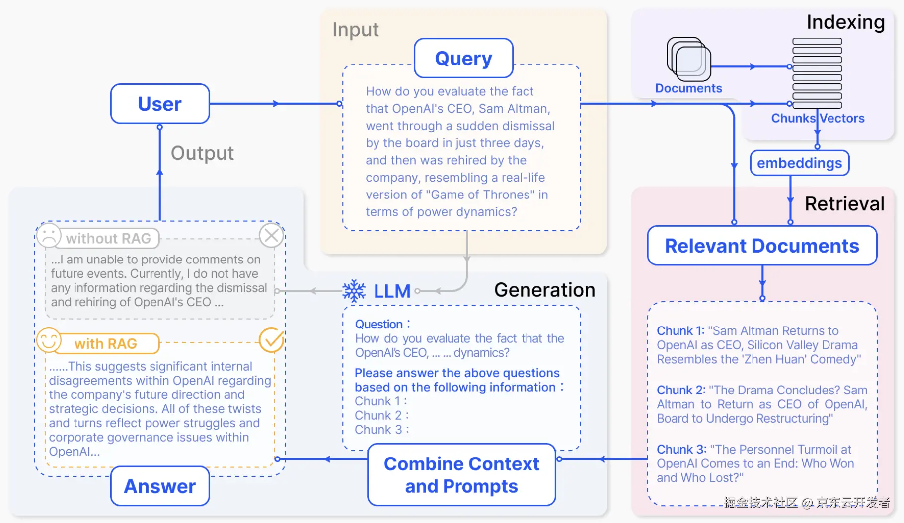RAG引入信息检索过程,通过第三方数据库中检索相关信息来增强LLM的生成过程,从而提高准确性和鲁棒性,降低幻觉。由于接入外部实时动态数据,RAG在理论上没有知识边界的限制,且无需频繁进行LLM的训练,故已经成为LLM行业落地最佳实践方案。下图1为RAG的一个标准实现方案[11],用户的Query首先会经由信息检索模块处理并召回相关文档;随后RAG方法将Prompt、用户query和召回文档一起输入LLM,最终由LLM生成最终的答案。