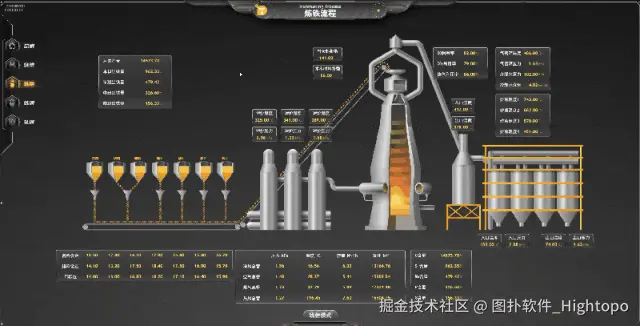 炼铁过程本质上是从矿石等含铁化合物中提取铁的过程。图扑软件利用其丰富多样的可视化组件,为炼铁工艺提供了清晰且美观的 2D 可视化服务。通过二维组态图展示热风炉和高炉,同时在 2D 组态面板中集成了如出铁量、炉温度与压力、入口温度和压力等关键数据信息,有效地帮助降低能源消耗和成本。