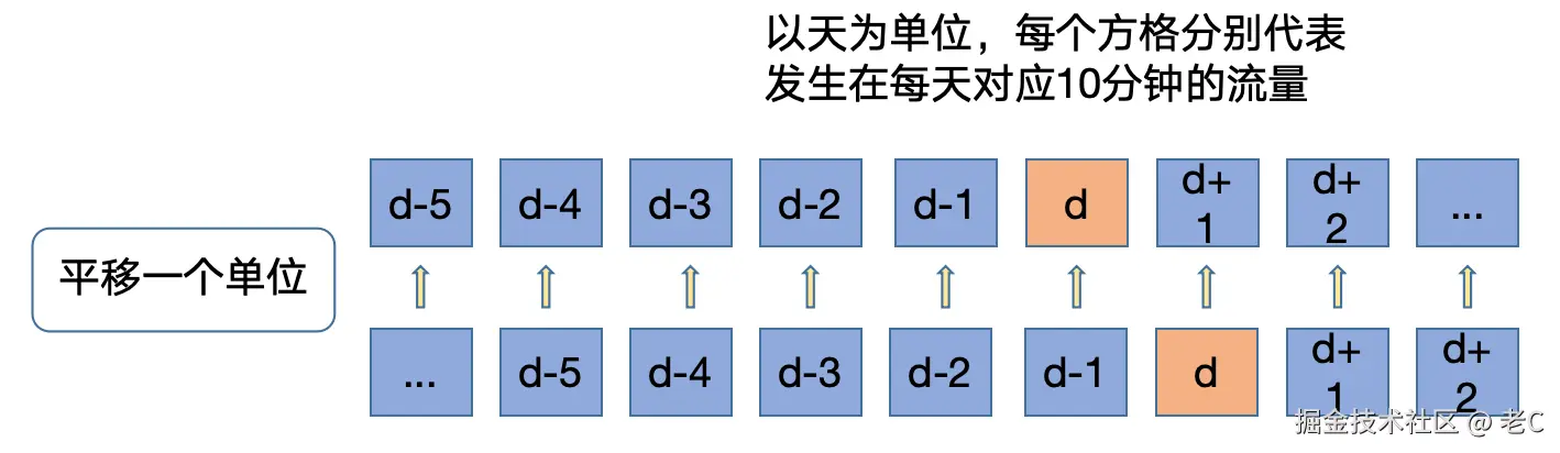 - 历史平移特征: 通过历史平移获取上个阶段的信息;如下图所示,可以将d-1时间的信息给到d时间,d时间信息给到d+1时间,这样就实现了平移一个单位的特征构建。