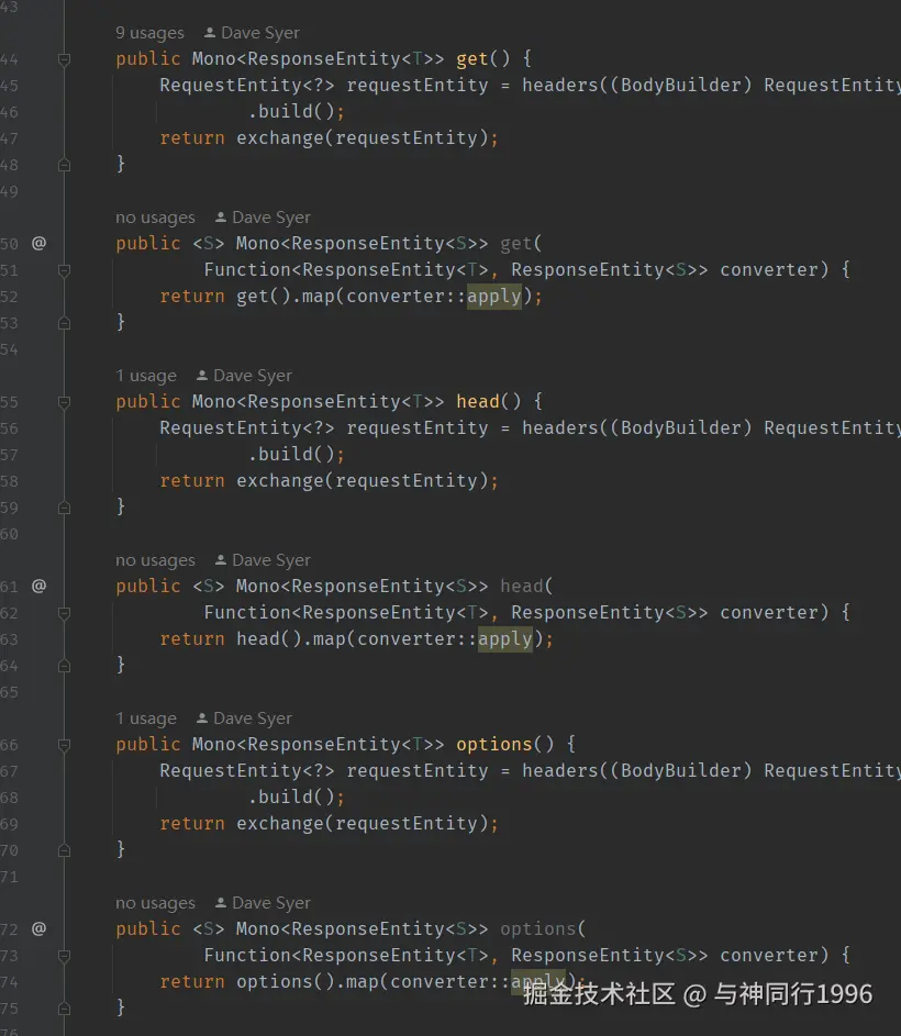 目录结构与WebMvc模块保持一致,原理都是通过继承HandlerMethodArgumentResolver,来劫取请求。但是这里的ProxyExchange发生了改变,返回值都变成了Mono对象