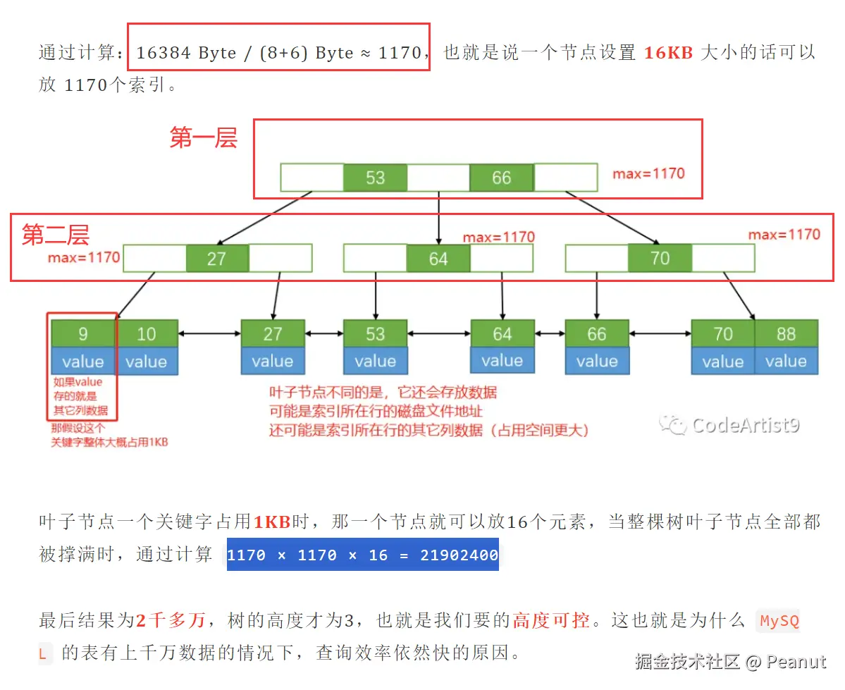 16384 Byte / (8+6) Byte ≈ 1170,也就是说一个节点设置 16KB 大小的话可以放 1170个索引。