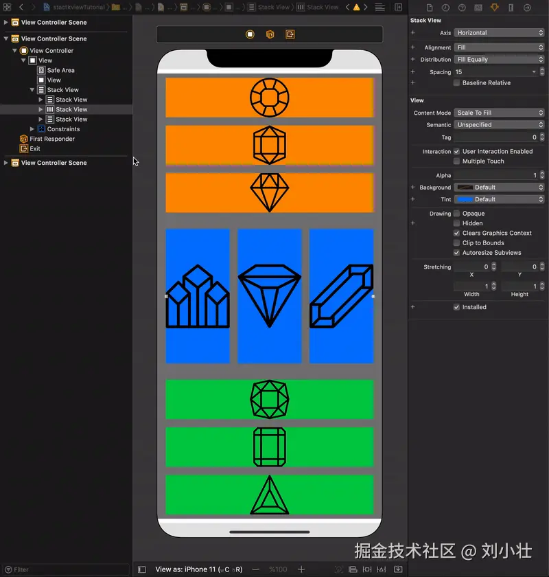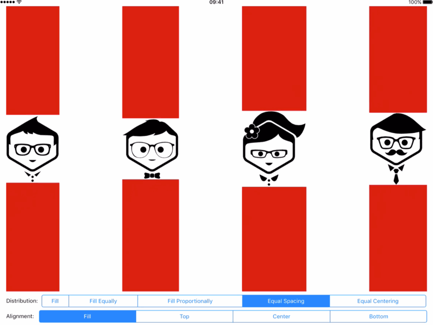 fill:填充整个UIStackView,并且根据内部子视图尺寸进行动态调整,可能会拉伸或压缩某个子视图,可以通过ContentHuggingPriority和ContentCompressionResistancePriority控制拉伸和压缩的视图,后面会讲到。