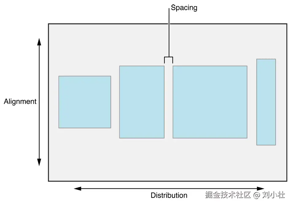 前端的布局方式比较灵活,提供有Flex的布局方式,可以实现不同方向的弹性布局。Flex就像一个容器,可以将其内部的子控件统一进行布局。其包含主轴方向和交叉轴方向,主轴方向表示控件的排布方向,交叉轴方向和主轴方向相垂直。熟悉前端Flex控件的同学应该知道。Flex有一些常用属性,这里对其进行简单介绍,方便了解UIStackView的技术背景。