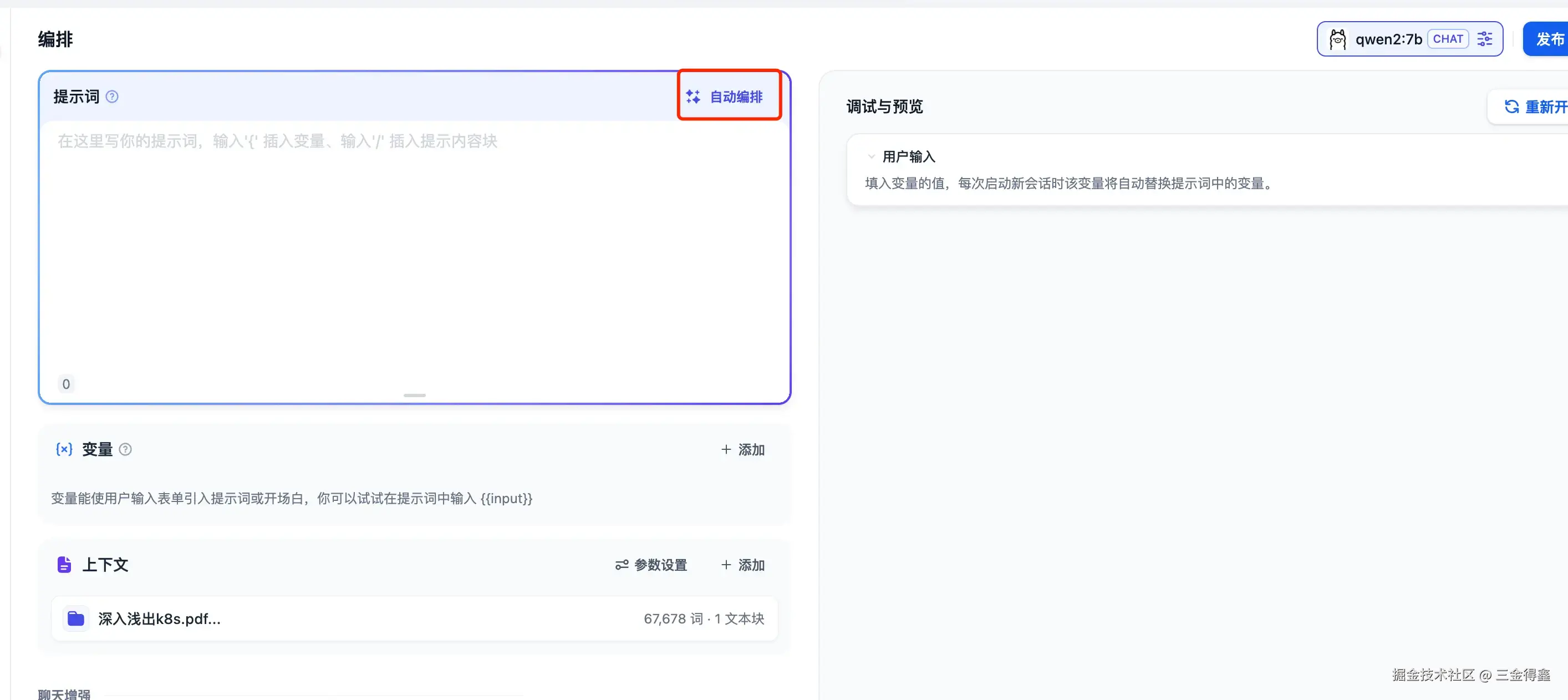 接下来我们将刚刚创建的知识库添加到应用中去,并给应用添加提示词。如果不知道怎么编写提示词,还可以点击右上角的自动编排让 AI 帮助我们完成: