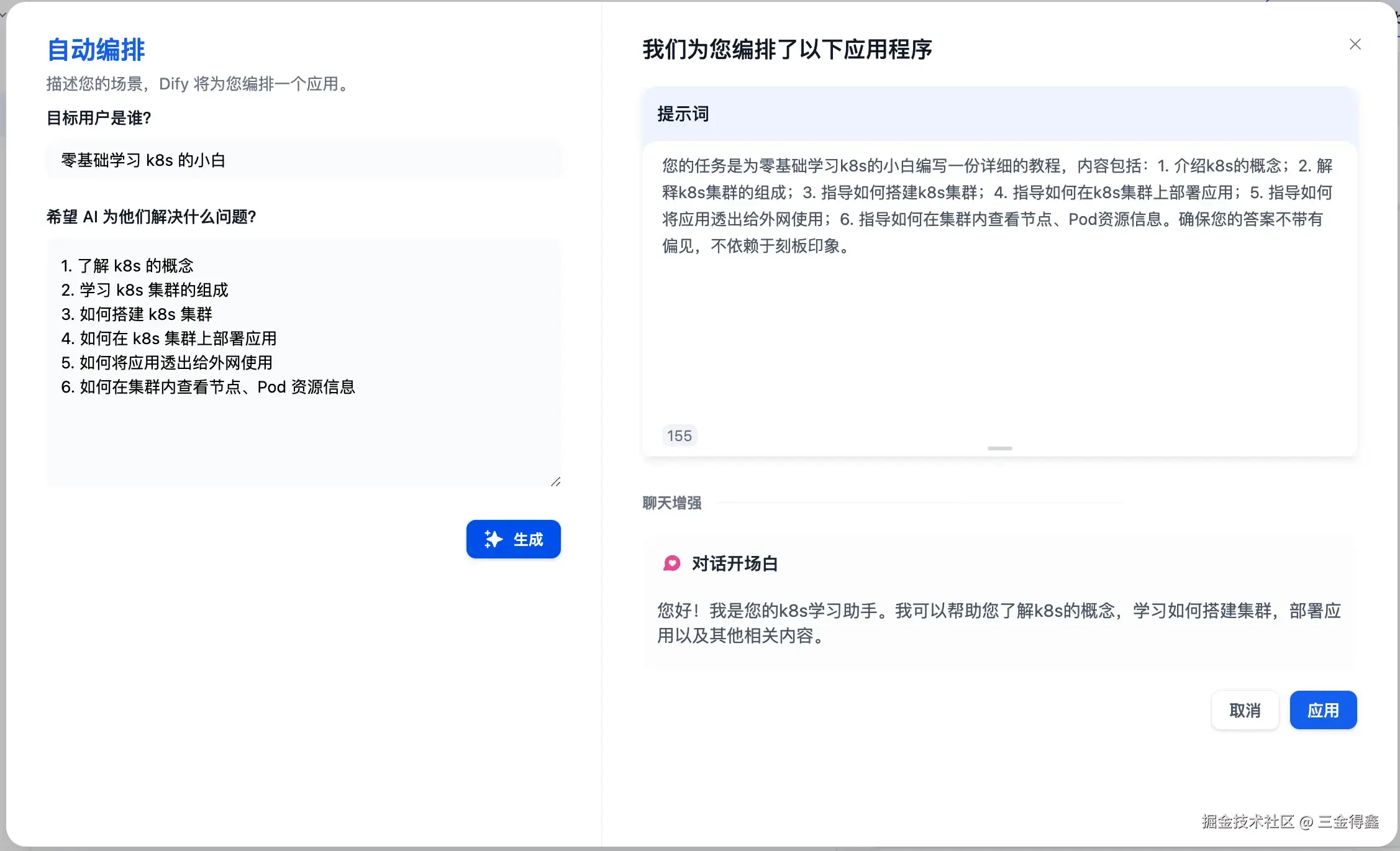 点击右下角的「应用」按钮,就会自动为我们添加这些提示词和开场白到应用中了: