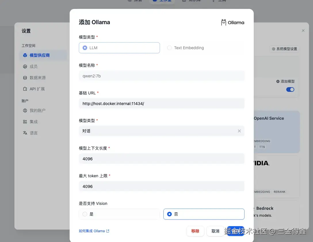 还是在设置的弹窗中选择「模型供应商」,这次我们选择 Ollama,以 qwen2:7b 模型为例: