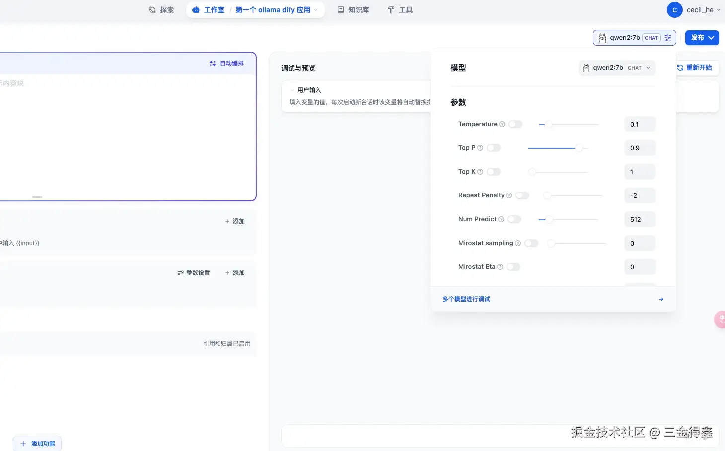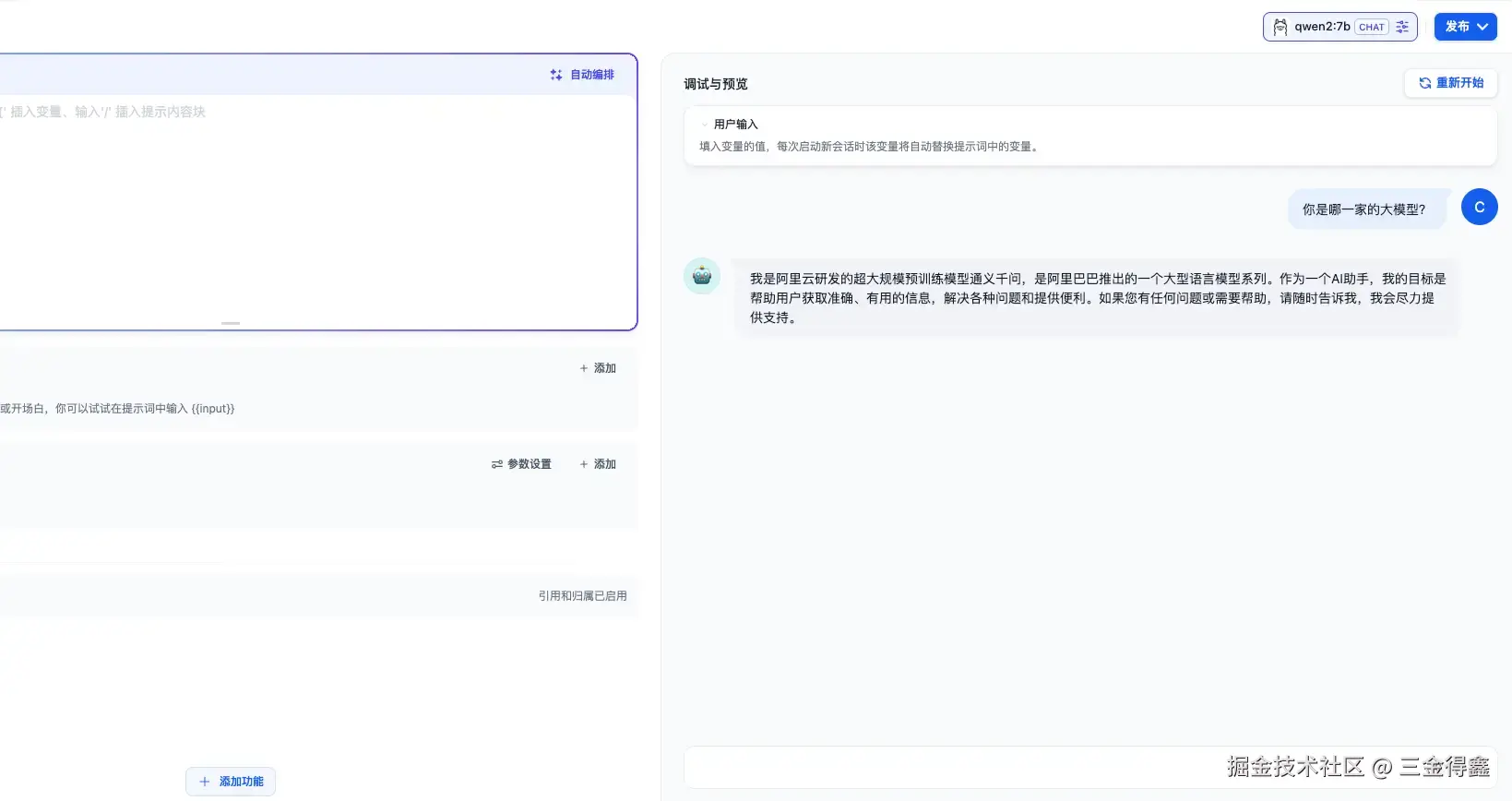 回到创建的应用中,在编排页面的右上角切换大模型为 qwen2:7b: