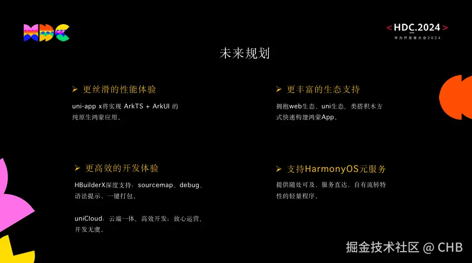 面向未来,uni-app团队会持续对鸿蒙开发进行优化,重点会在性能体验、生态支持、开发体验、元服务等维度进行迭代升级。