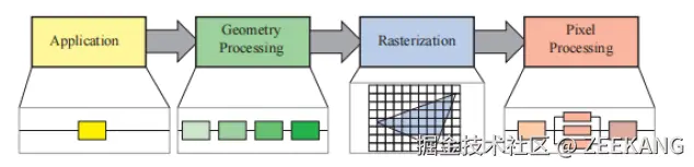 应用阶段(application)、几何处理阶段(geometry processing)、光栅化阶段(rasterization)和像素处理阶段(pixel processing)