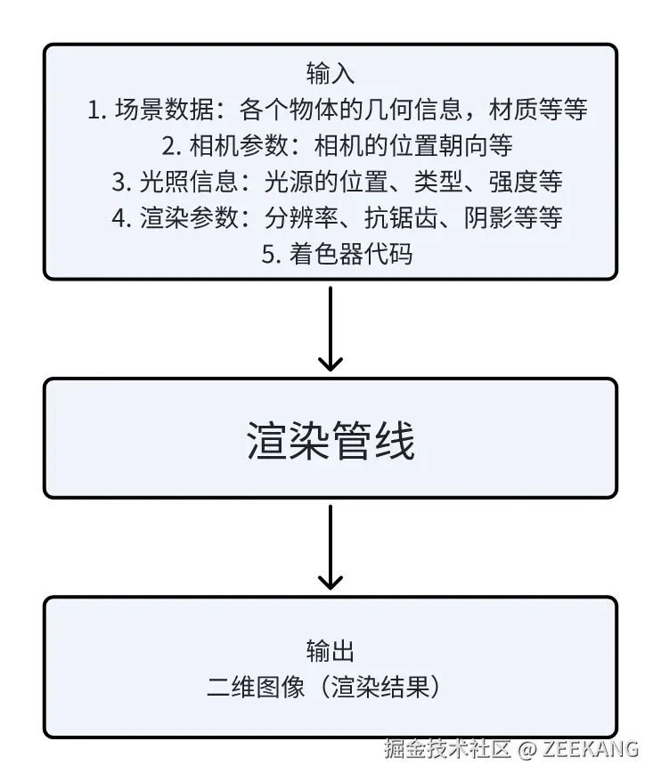 - 准备场景数据、例如摄像机的位置、视锥体、场景中的模型、光源等信息
