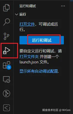 在VS Code中先点击下图中标识为①的图标后,在点击标识为的②的地方,创建launch.json文件。