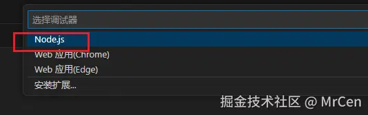 选择 Node.js 类型的调试器
