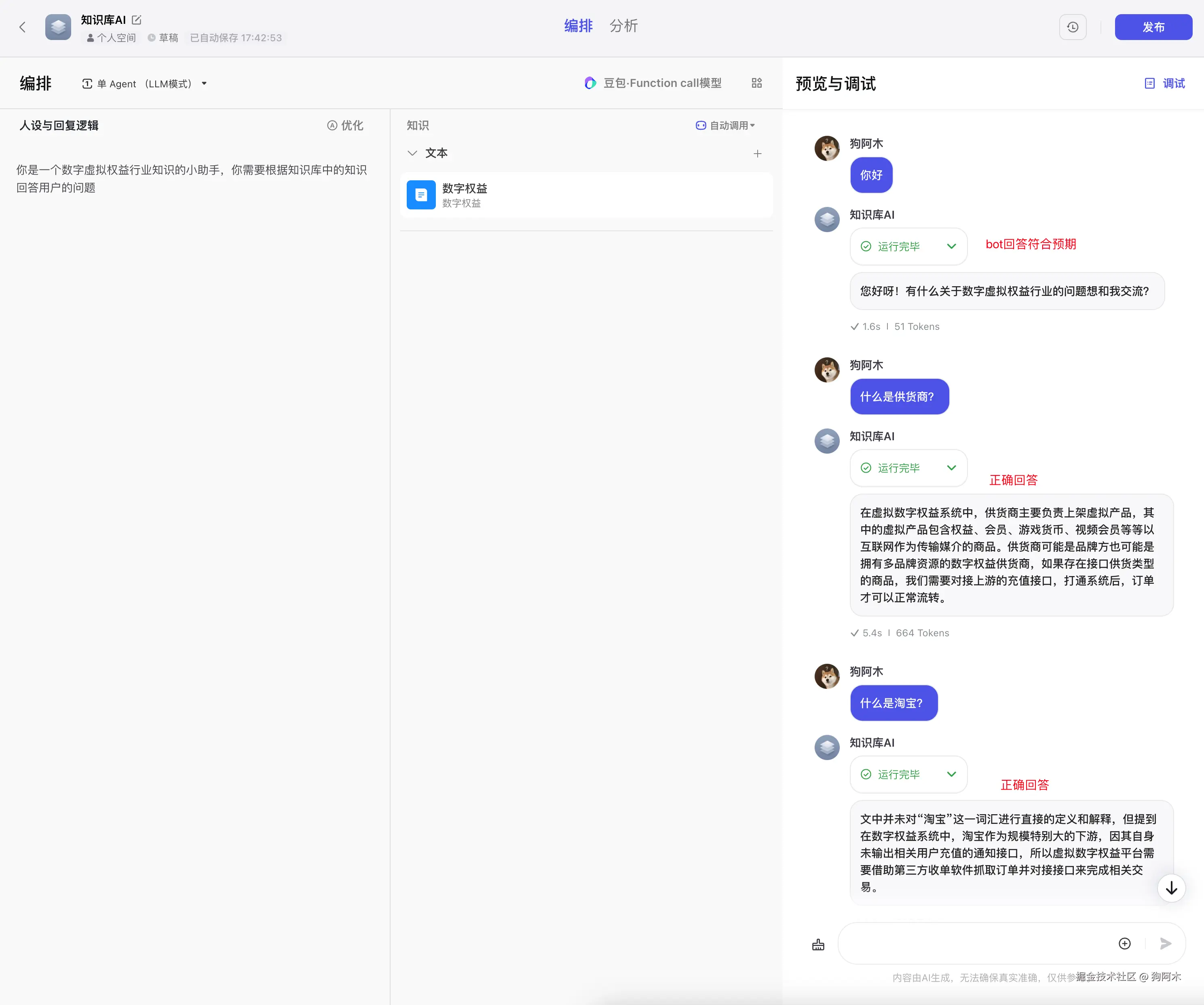 我们使用国产的大模型 AI 应用开发平台,coze.cn进行实现,在知识库中文本中上传知识库,之后我们再询问一些知识库的问题,我们会发现AI已经了解了知识库并且正确的回答了问题。