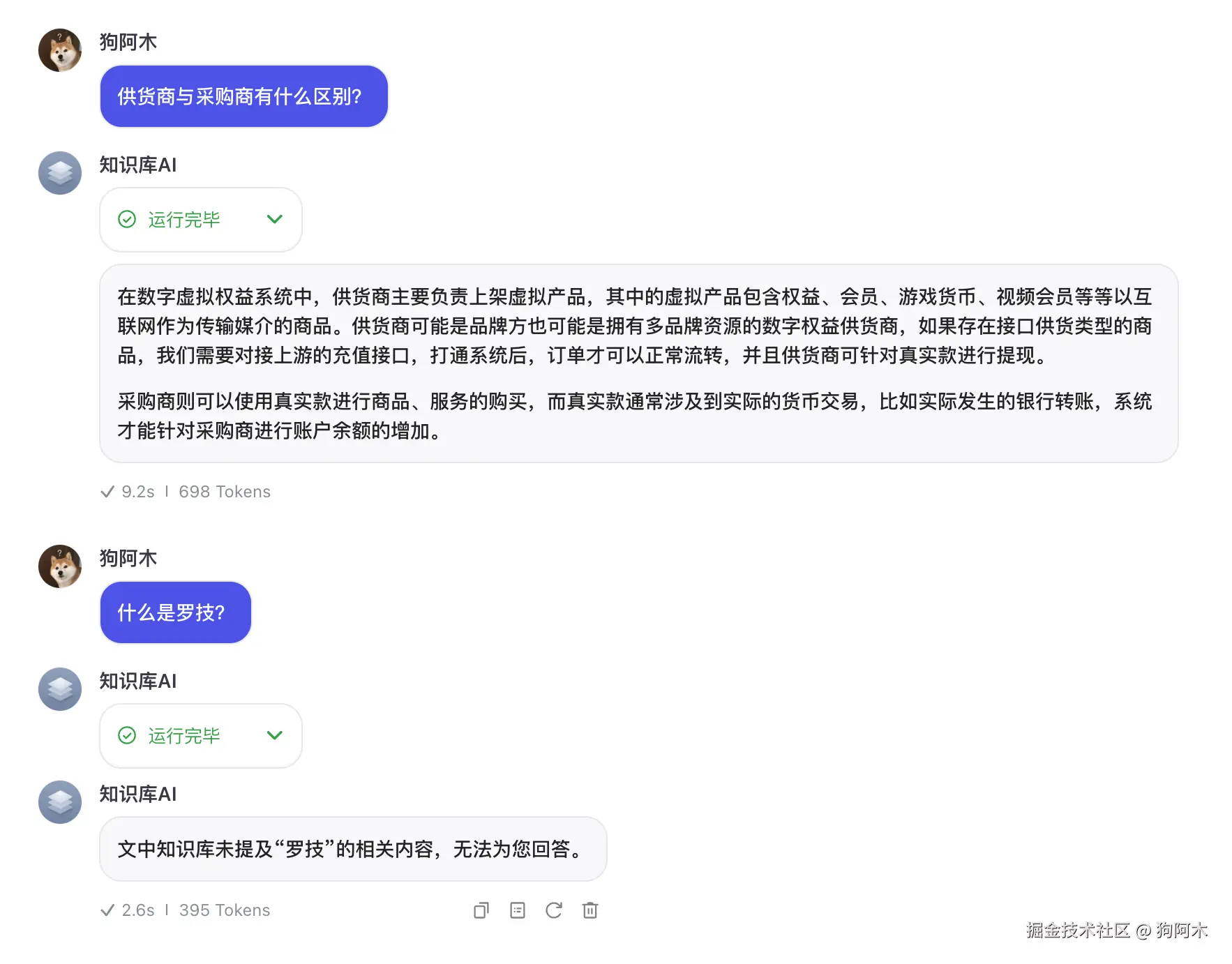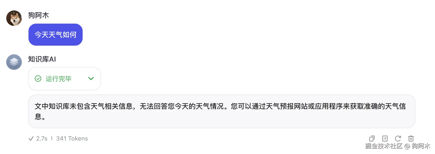 现在我们问的一些问题比较简单,我们也可以问一些更加复杂的问题,比如知识库不存在的知识,或者知识库存在的知识,但是需要思考总结的。