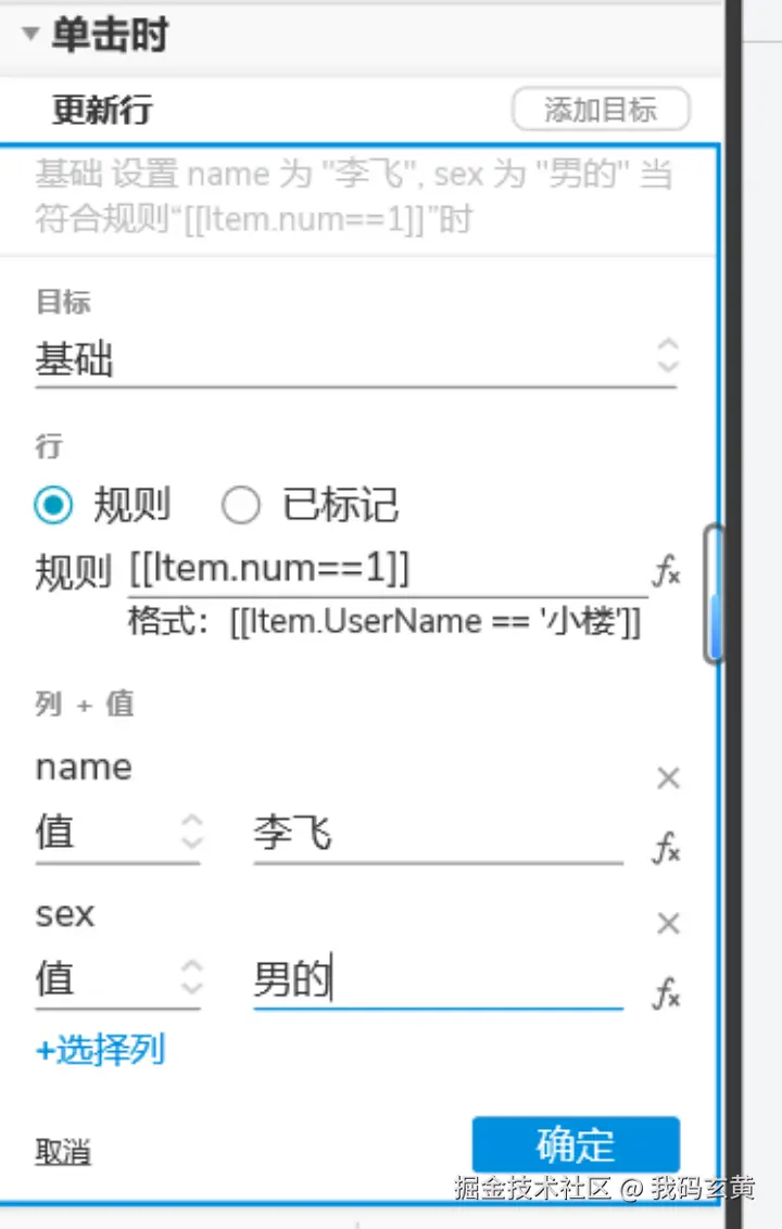 接下来我们来尝试修改某一行的数据,拖动一个新按钮然后给按钮添加【中继器动作】中的【更新行】,这里的意思是根据规则更新数据。