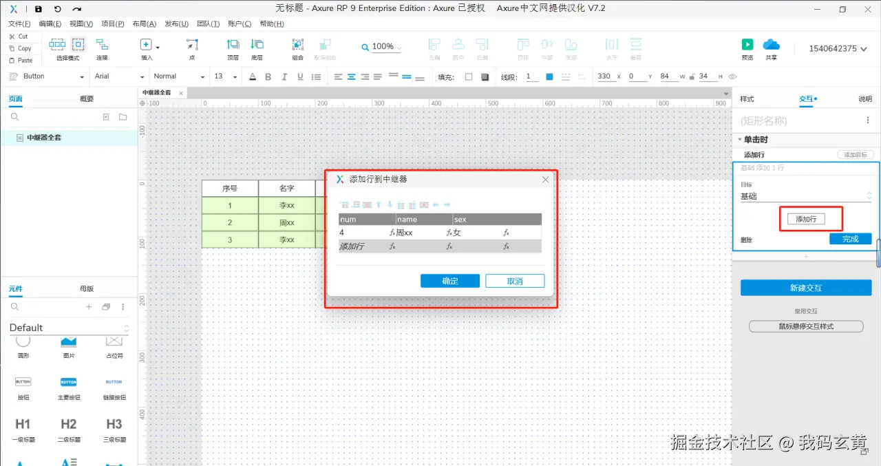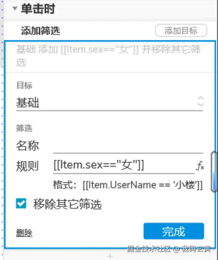 最后来做筛选的功能,同样拖入一个按钮,给它添加【中继器事件】中的【添加筛选】动作,这里我们筛选 性别为女的