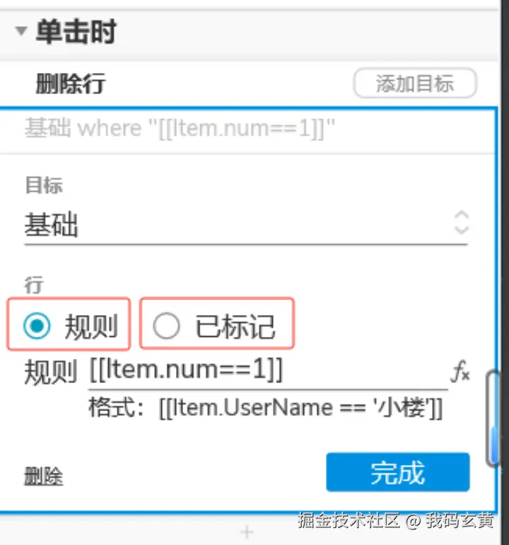 拖过来一个新的按钮当作删除按钮,给按钮添加点击事件选择【删除行】,可以发现需要我们选择【规则】或者【已标记】作为一个删除的条件。