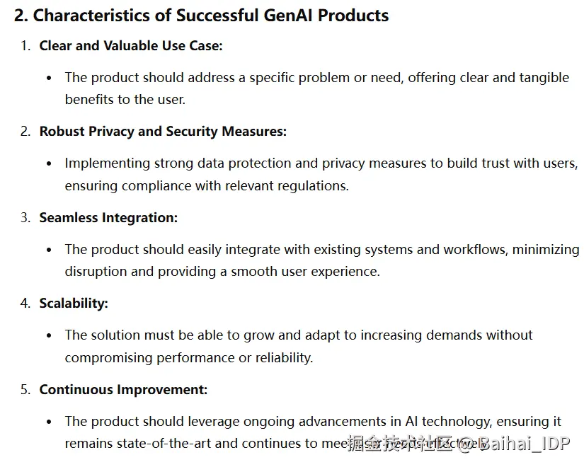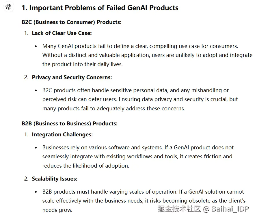 然而,这种肤浅的回答并未触及生成式 AI 的独到之处。原因很简单:这是一个新兴领域,GPT-4o 训练数据中关于 GenAI 产品成功要素的信息尚不充分。